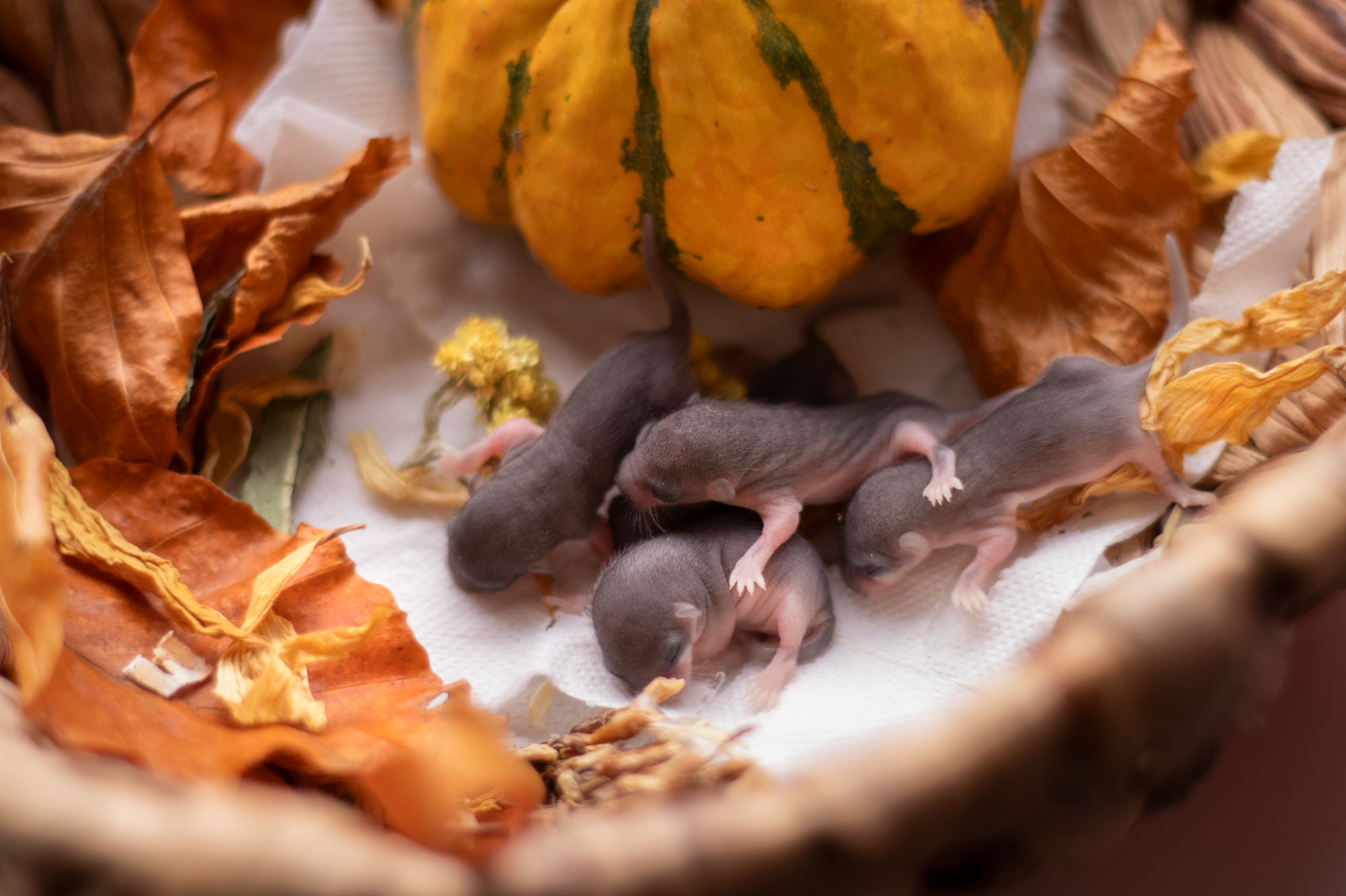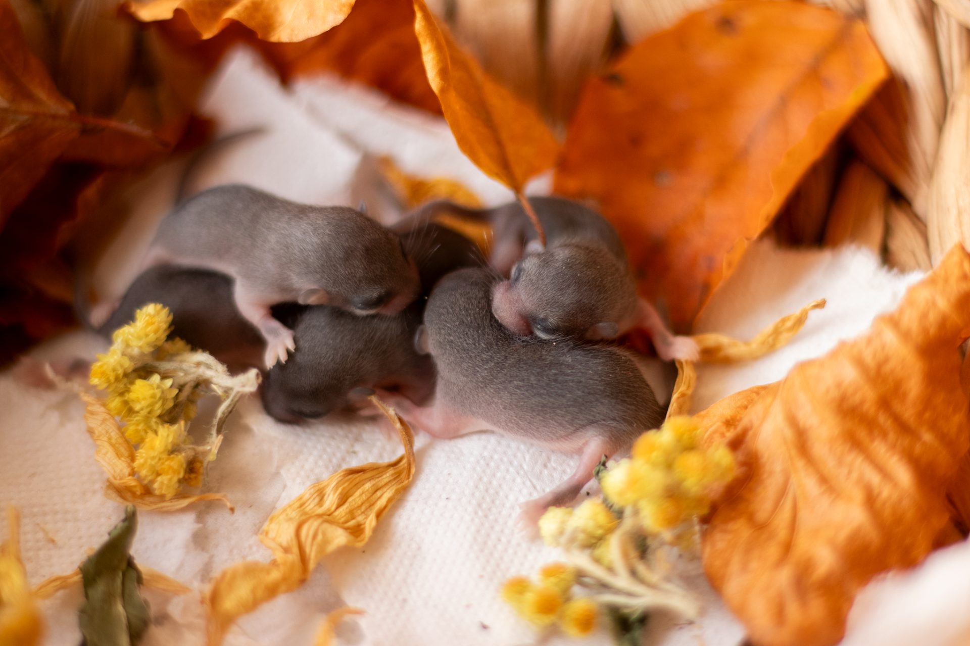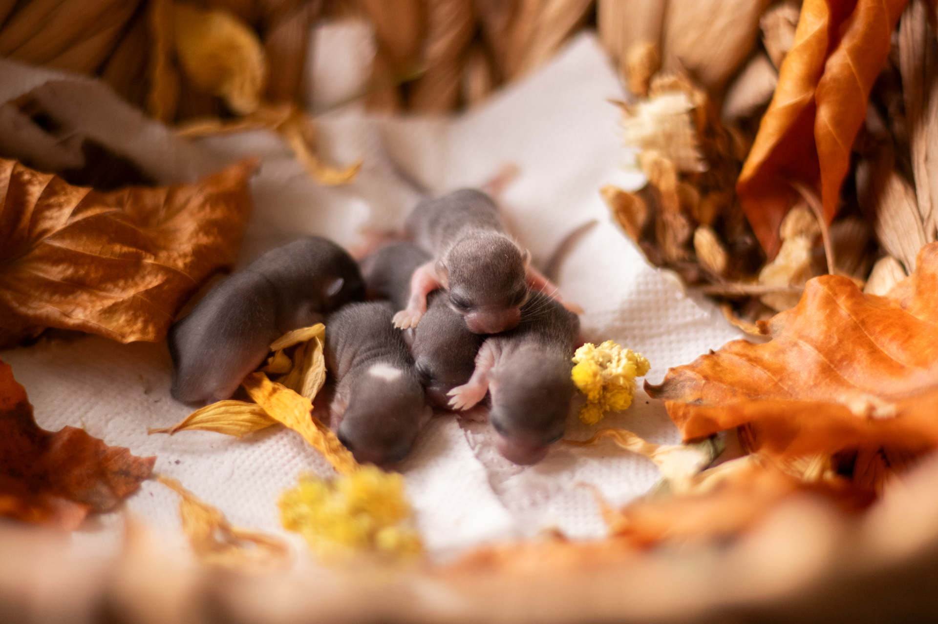 Sameček Tučík je běloocasý - v očekávání tedy byla i strakatá či běloocasá mláďata a opravdu, jedno plšátko má za krkem bílou skvrnku a jedno má strakaté bříško - stávají se tak prvními mutačními plšíky narozenými v našem chovu :)