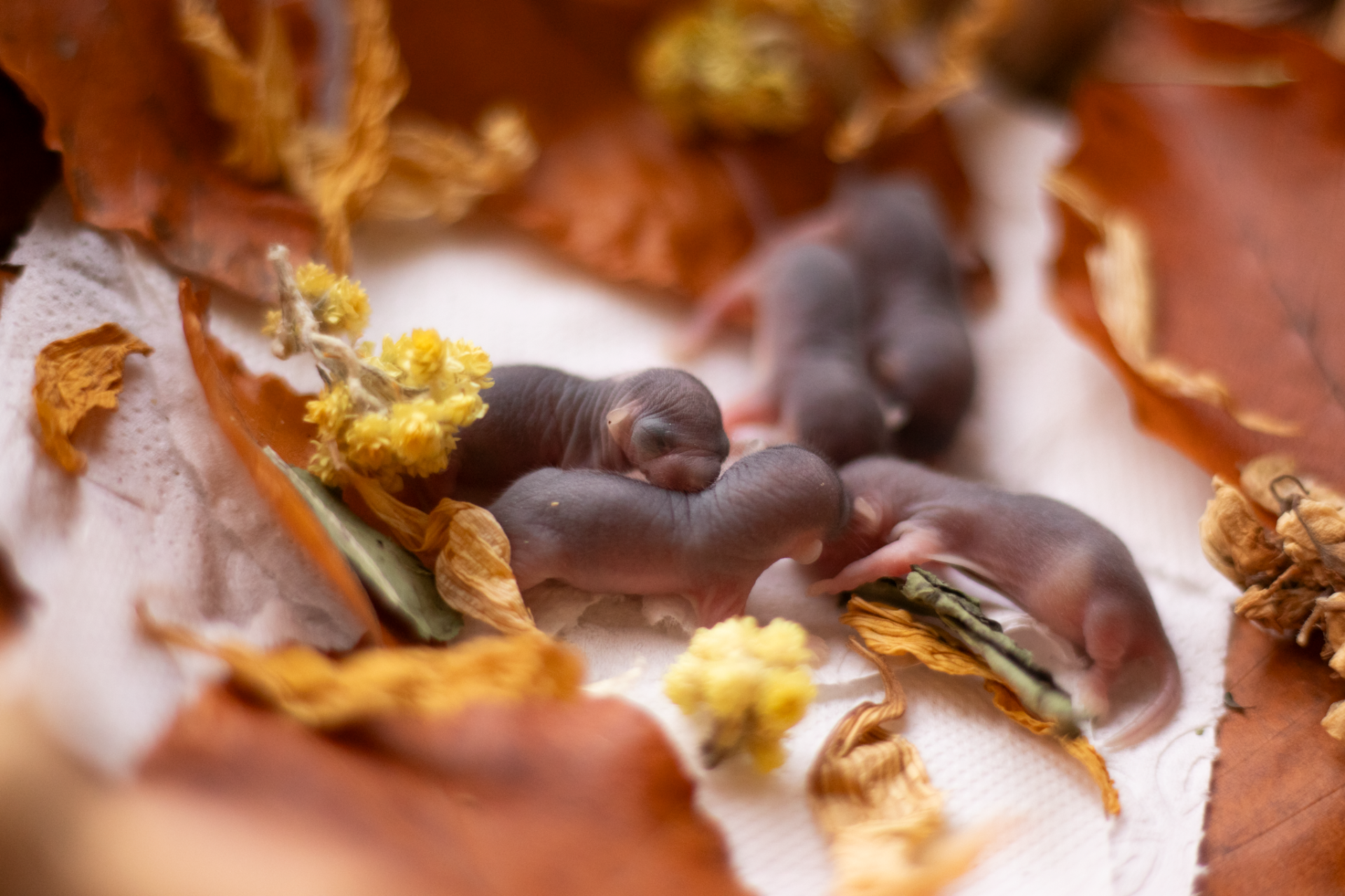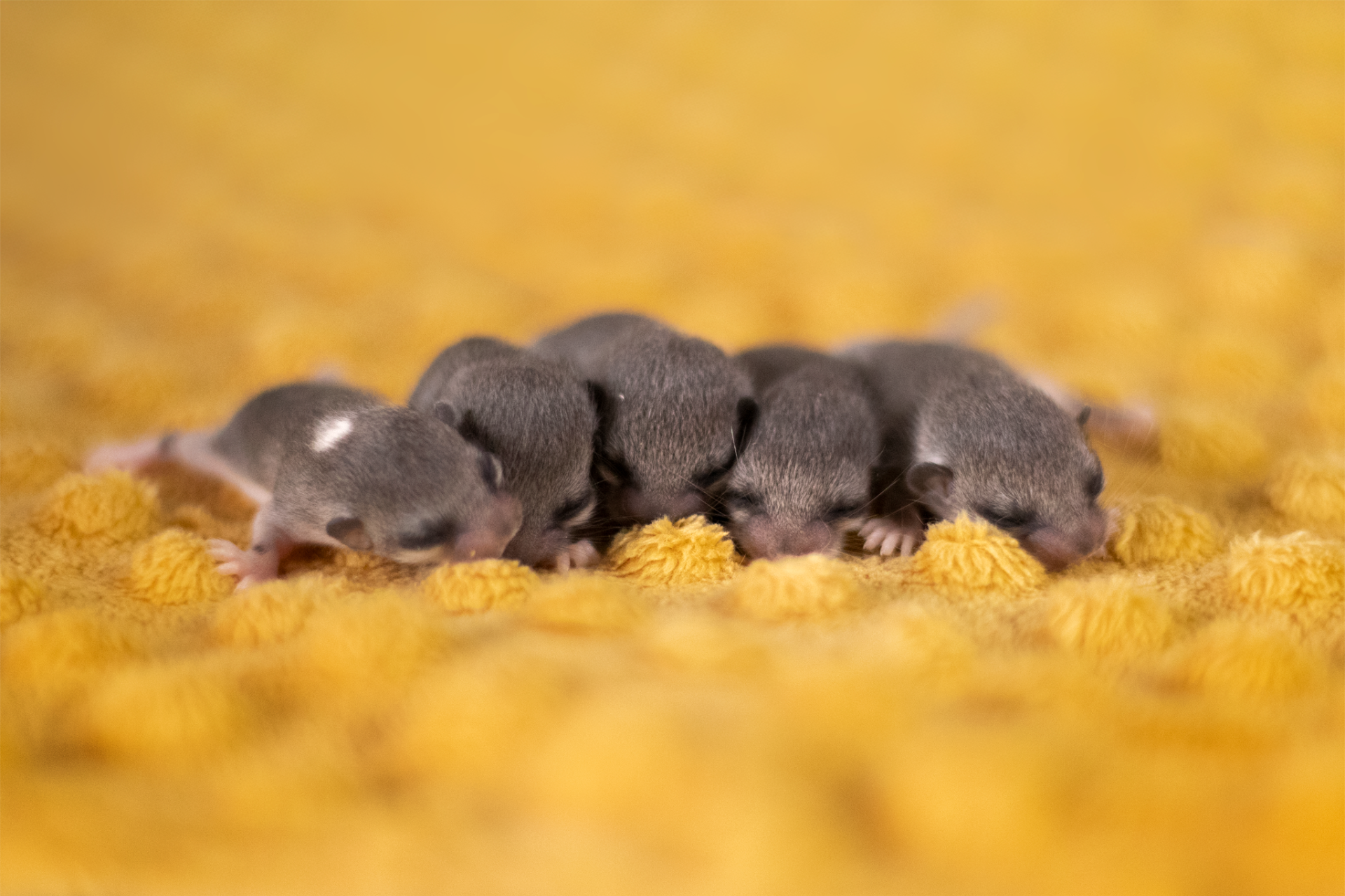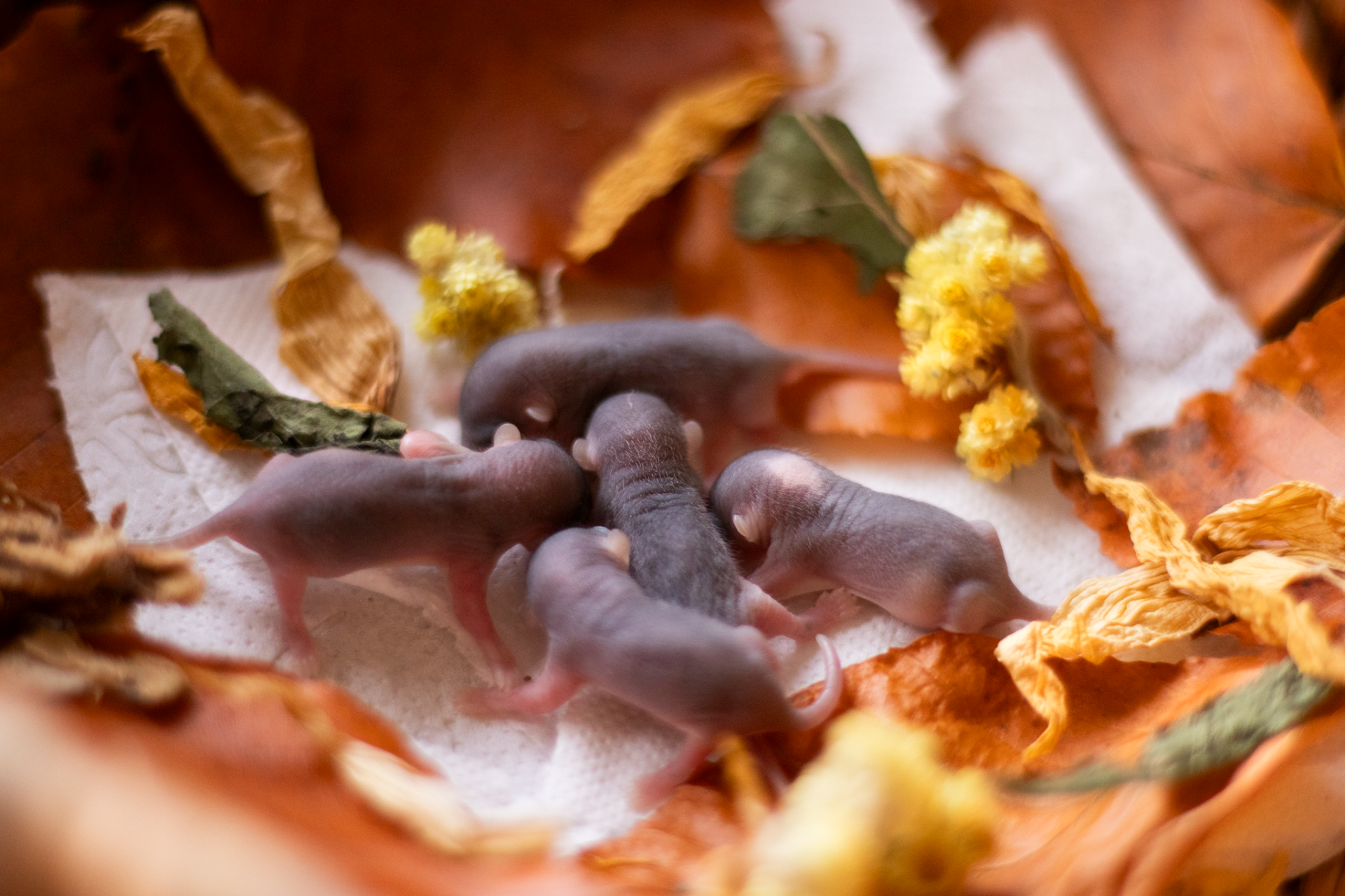 Sameček Tučík je běloocasý - v očekávání tedy byla i strakatá či běloocasá mláďata a opravdu, jedno plšátko má za krkem bílou skvrnku a jedno má strakaté bříško - stávají se tak prvními mutačními plšíky narozenými v našem chovu :)